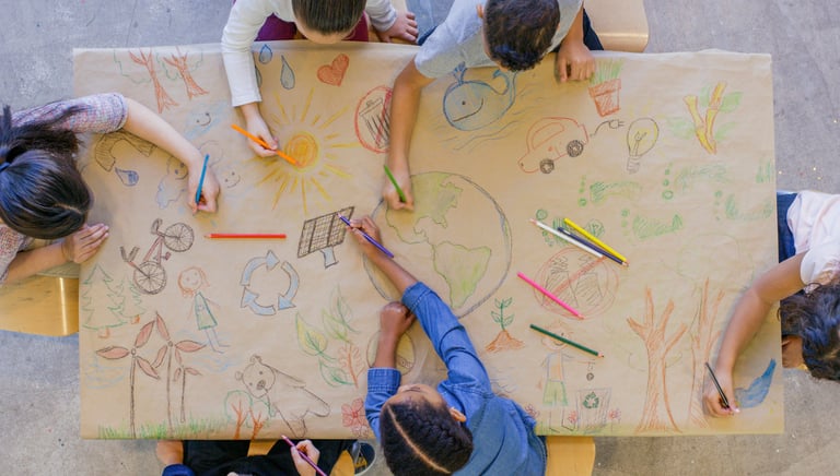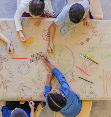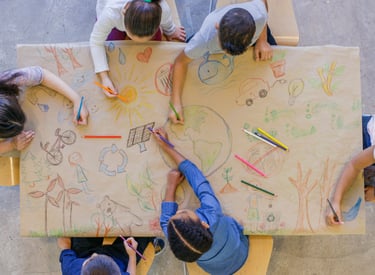 Un atelier créatif où les enfants colorient ensemble une grande fresque pour créer une œuvre commune et partager un moment convivial.