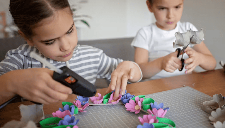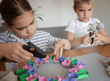 Un atelier créatif où les enfants décorent des lunettes en carton avec couleurs et formes pour un accessoire original et amusant.